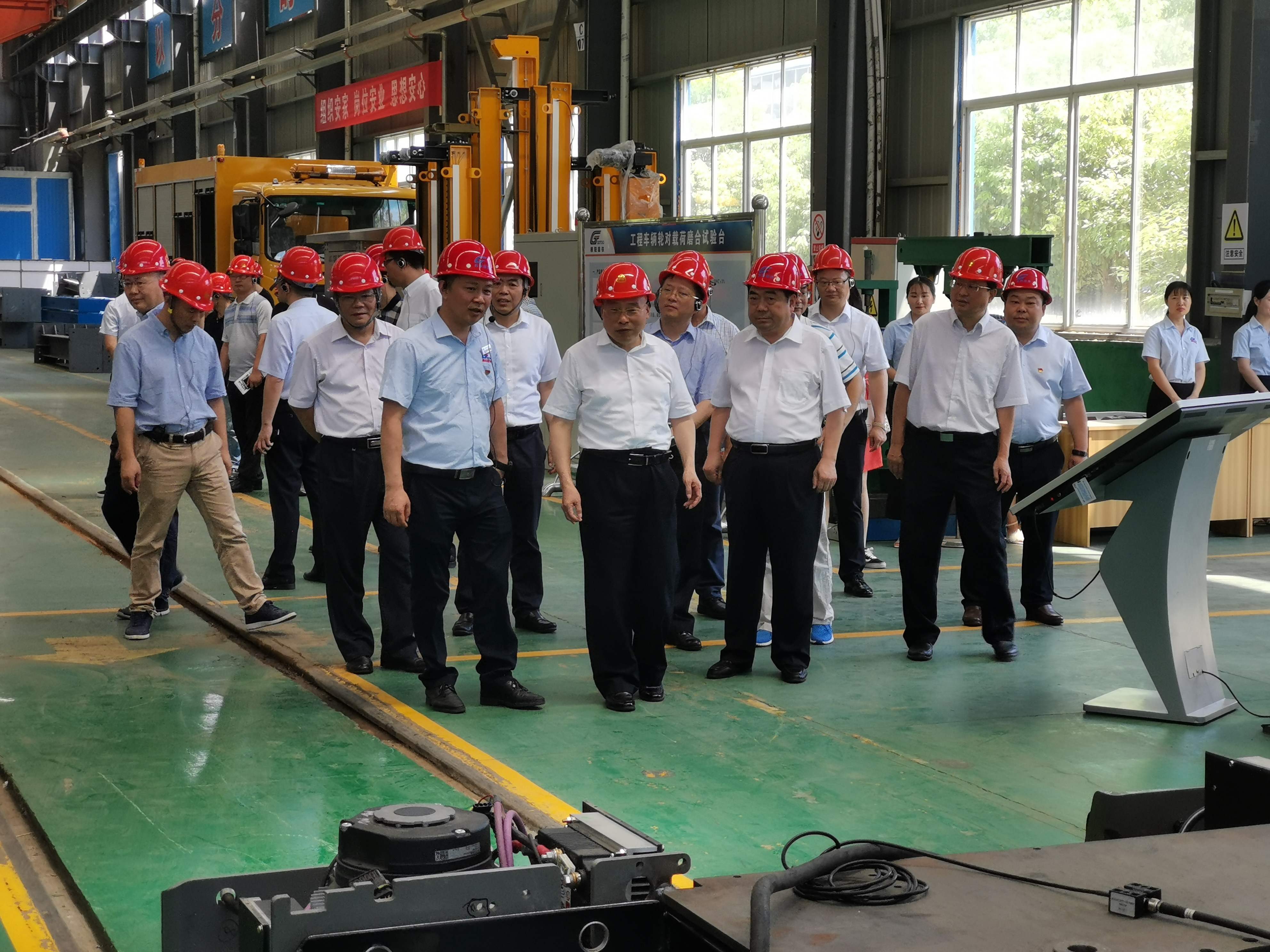 張清杰校長(zhǎng)、李德璋副市長(zhǎng)等一行走出展廳步入生產(chǎn)車(chē)間,邊走邊看,不時(shí)詢(xún)問(wèn)生產(chǎn)操作人員和技術(shù)人員,在新產(chǎn)品研發(fā)車(chē)間參觀了輪對(duì)、受電弓在線激光檢測(cè)系統(tǒng)公鐵兩用車(chē)等創(chuàng)新產(chǎn)品。